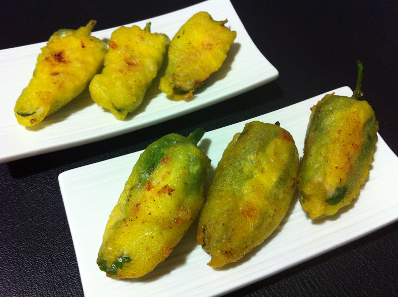 | Pimientos rellenos con la mezcla de quesos y jamón. |