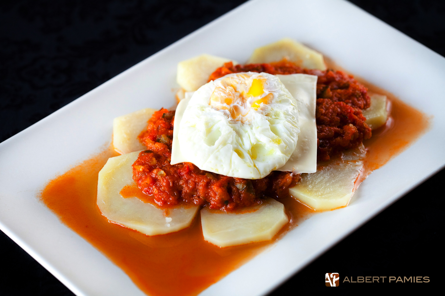 - Para montar el plato ponga una capa de patatas, el pisto por encima y el huevo al final
