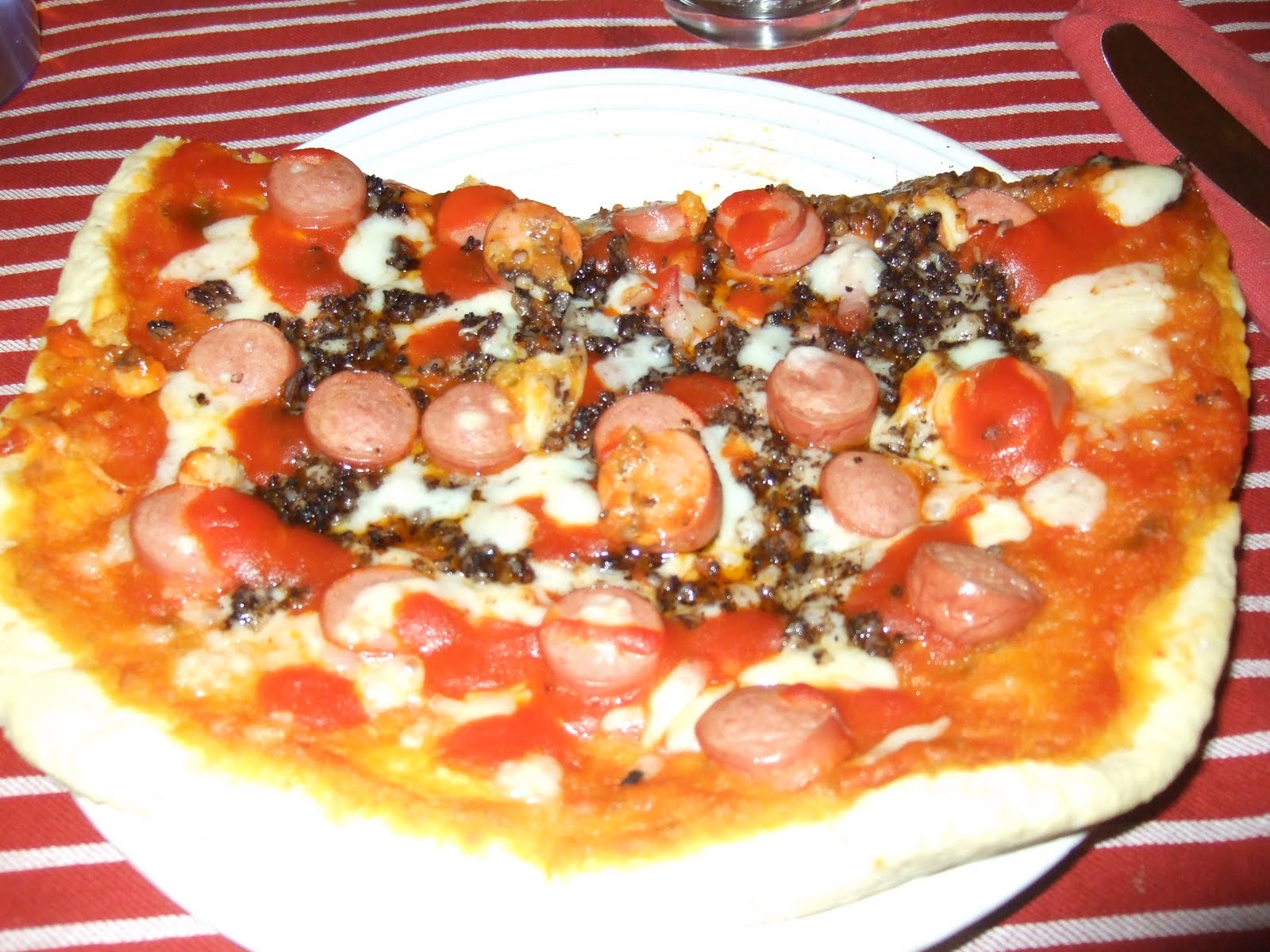 Yo la hice de tomate, queso rallado, salchichas, morcilla triturada a velocida 5 y beicon en trocitos y este es el resultado.