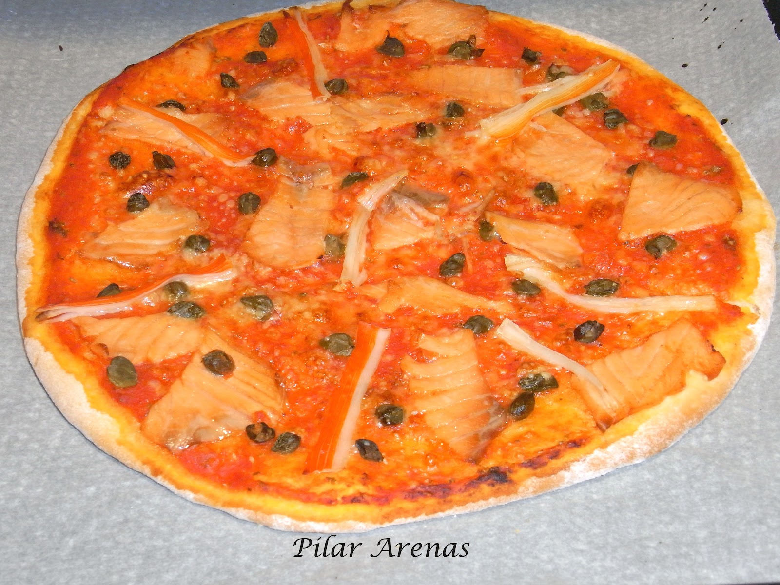 Nota.- Yo como no tenia todos los ingredientes de la receta, puse solamente el salmón, unas tiras de palitos de cangrejo, unas alcaparras y claro, el tomate. Os digo esto para que veais que las recetas en este caso pueden ser orientativas. Que la disfruteis.