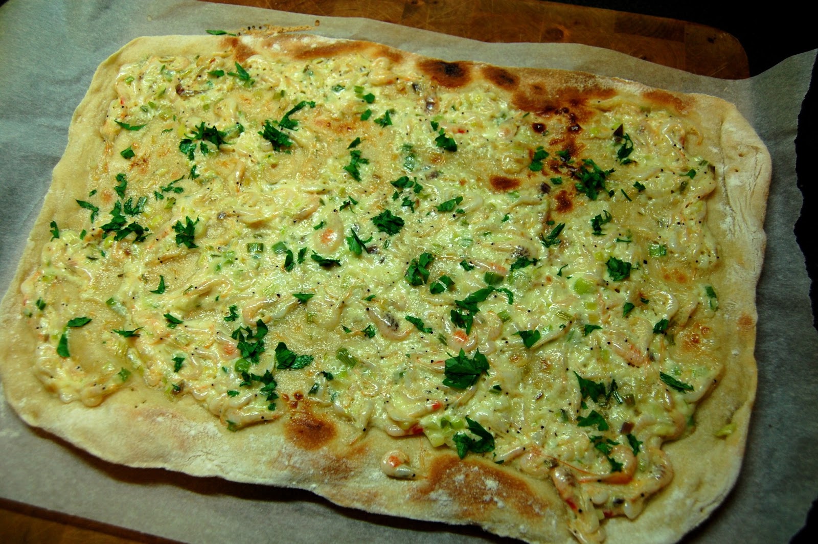 Cubrimos la pizza con la crema de nata, cebolletas y camarones y horneamos de nuevo otros 5 minutos.Para terminar, esparcimos el perejil picado por encima y cortamos en porciones individuales.