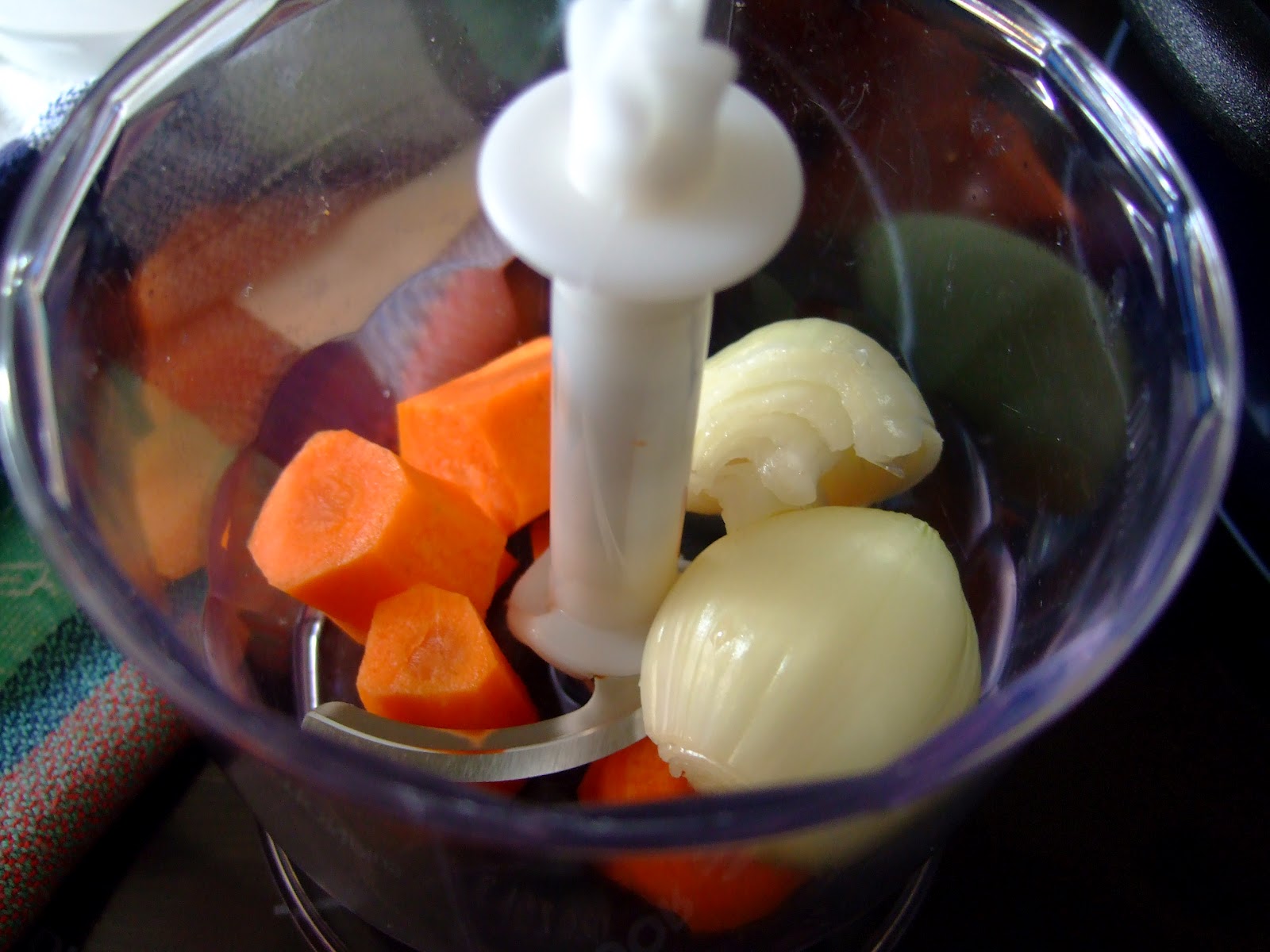 Se pela la cebolla y las zanahorias y se pican en la picadora.