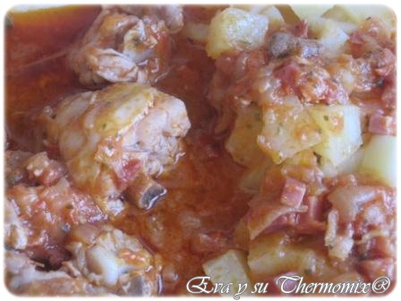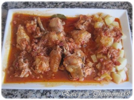 – Una vez que ha terminado ponemos la mariposa y añadimos el resto de los ingredienes y programamos 30 minutos, tempertura Varoma, giro a la izquierda y velocidad cuchara. Yo en este paso he aprovechado para cortar a taquitos un par de patatas y hacerlas al vapor en el Varoma a la vez que se hacía el pollo y luego las he utilizado de acompañamiento. También podeis acompañarlo de patatas fritas o de arroz.