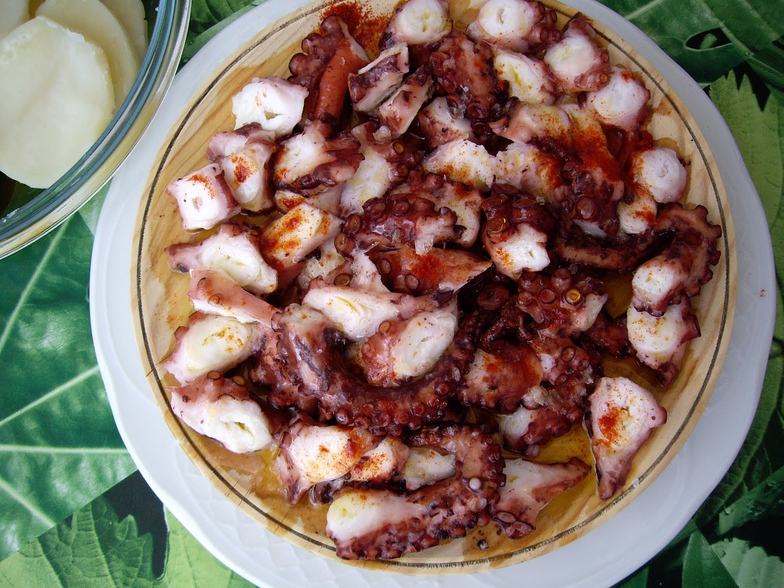 Retiramos del fuego y forzamos la salida de vapor.Dejamos que enfríe un poco dentro de la olla. Lo sacamos, troceamos y lo disponemos en el plato a servir (pudiendo ser de madera). Echamos sal gorda, aceite abundante y pimentón. A mí me gusta añadirle un poco de agua de la cocción y un diente de ajo picadito.