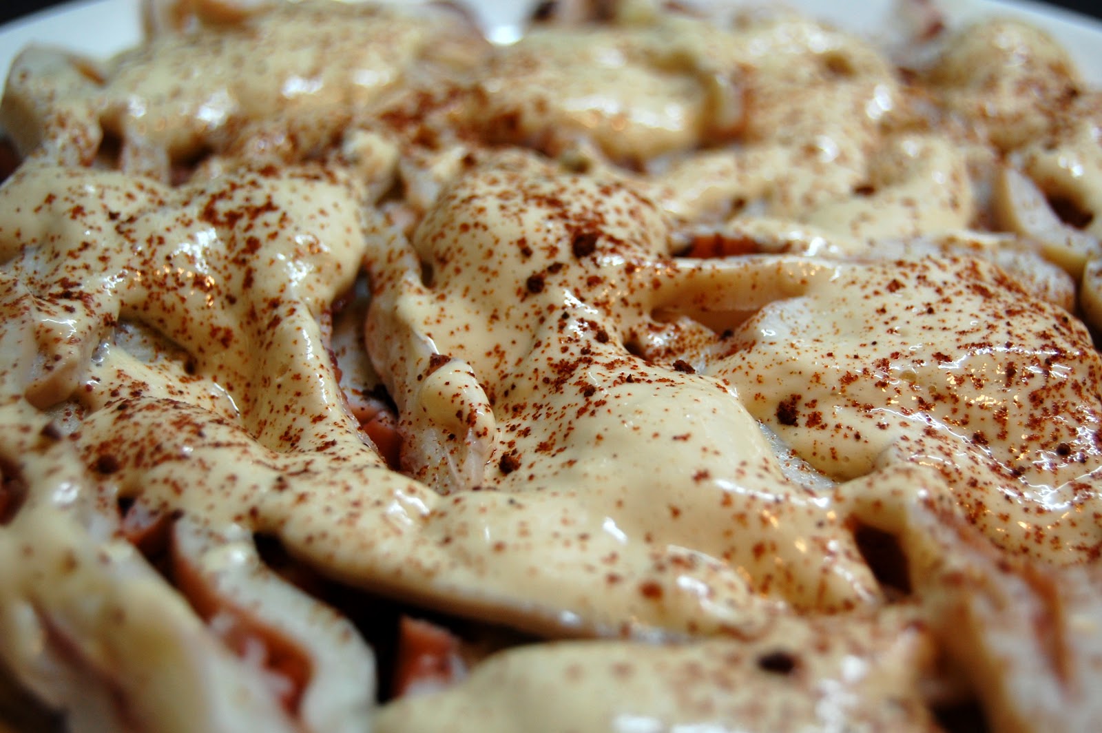 Para presentarlo, cortad el pulpo en rodajas lo más finas posibles y colocadlas en un plato grande. Echad la salsa por encima y terminad con un poco de pimentón (picante o dulce… al gusto).