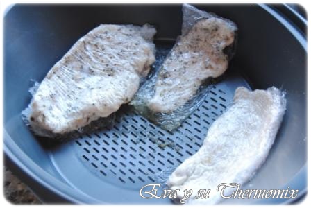 Durante los 25 minutos que tarda en hacerse el puré se pueden hacer unas pechuguitas de pollo al vapor en el Varoma, para ello sazonar las pechugas al gusto y envolverlas en papel film transparente.