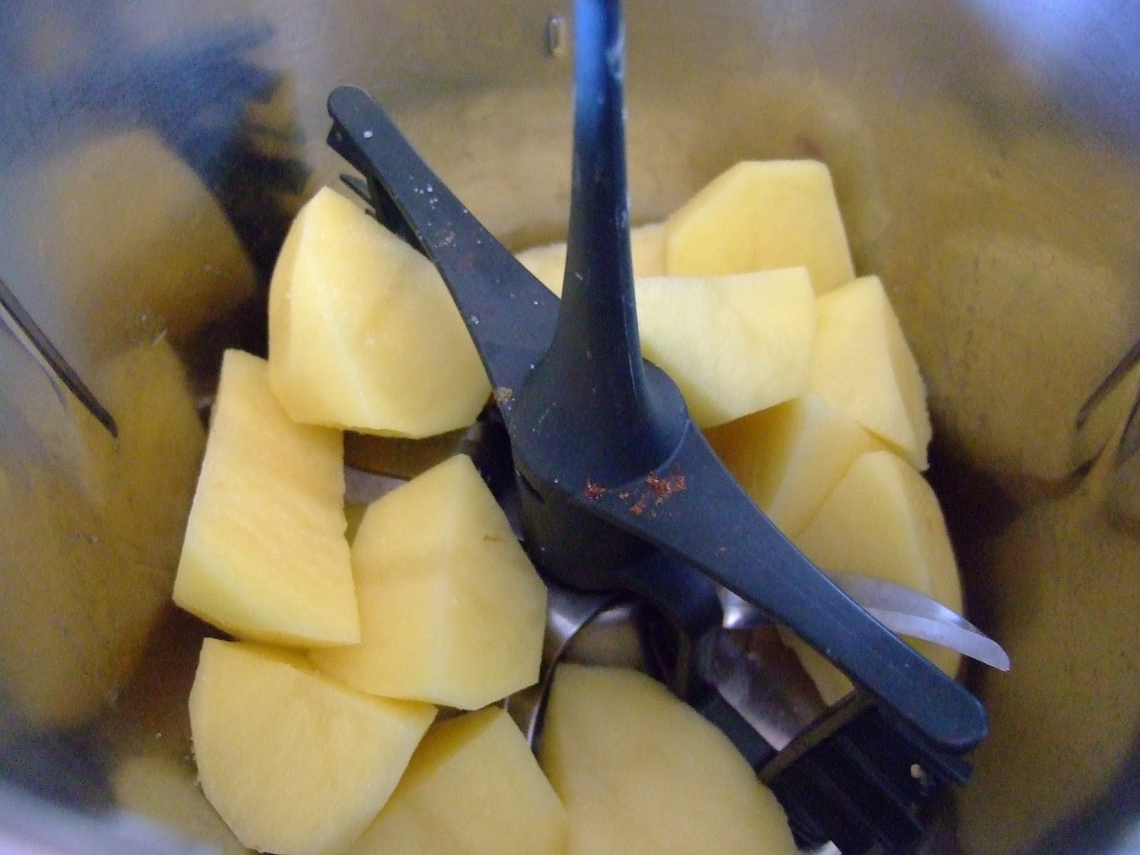 Poner la mariposa y echar las patatas en trozos, con la sal y la leche.