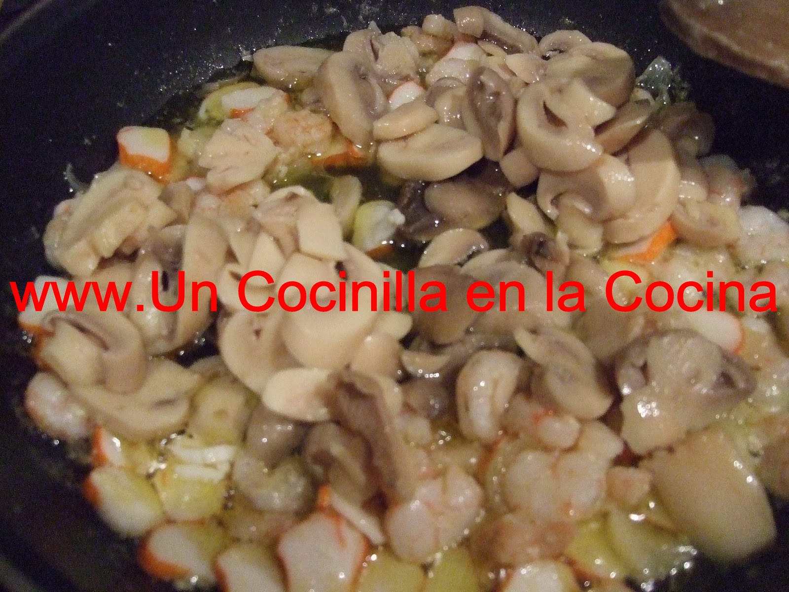 Se deja que se doren y antes de terminar se le añade la cebolla y los palitos en trozos.
