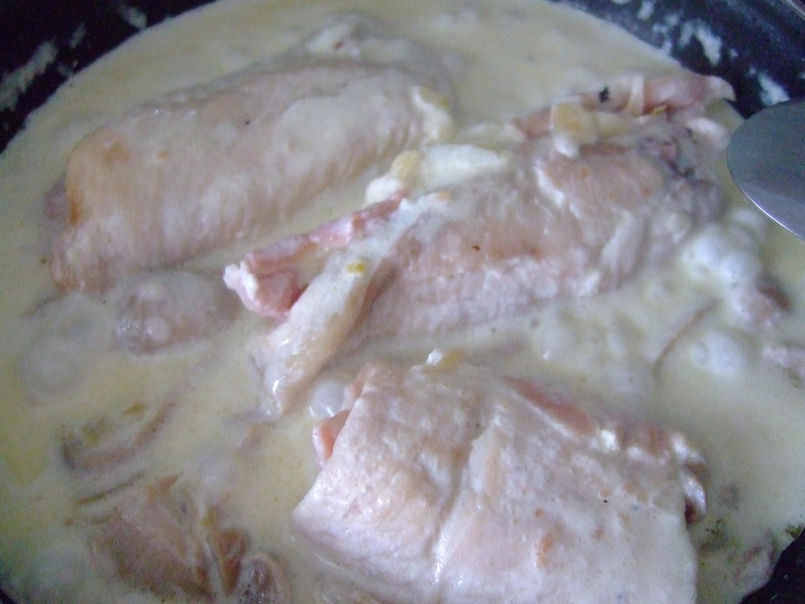 Se añade la Nata liquida y se deja que se cueza bien. Junto a los filetes que que los sacamos del microondas.