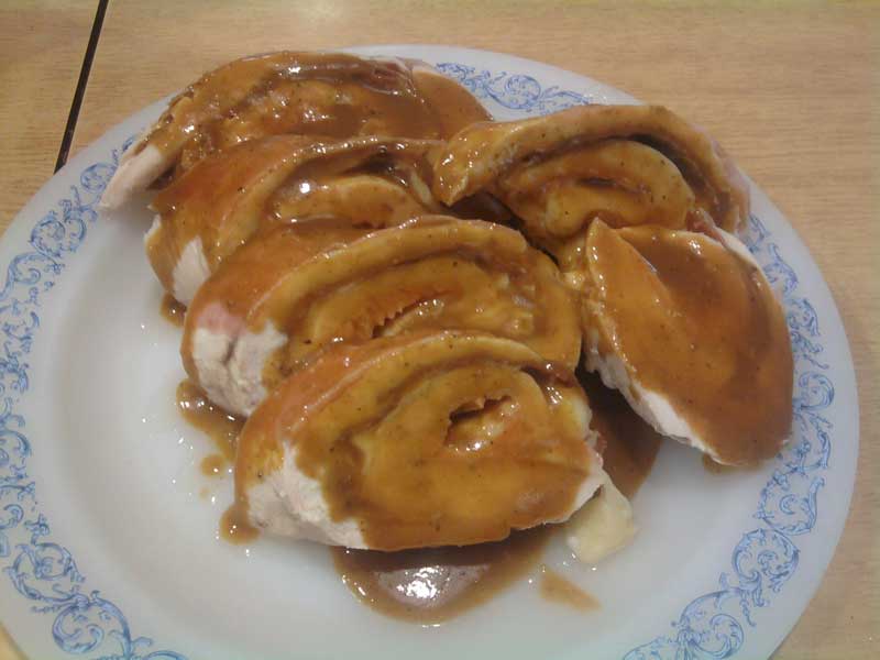 Cortamos el rollo de pollo diagonalmente en lonchas y lo servimos acompañado con la salsa agridulce.