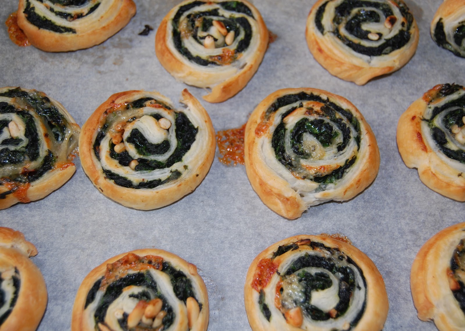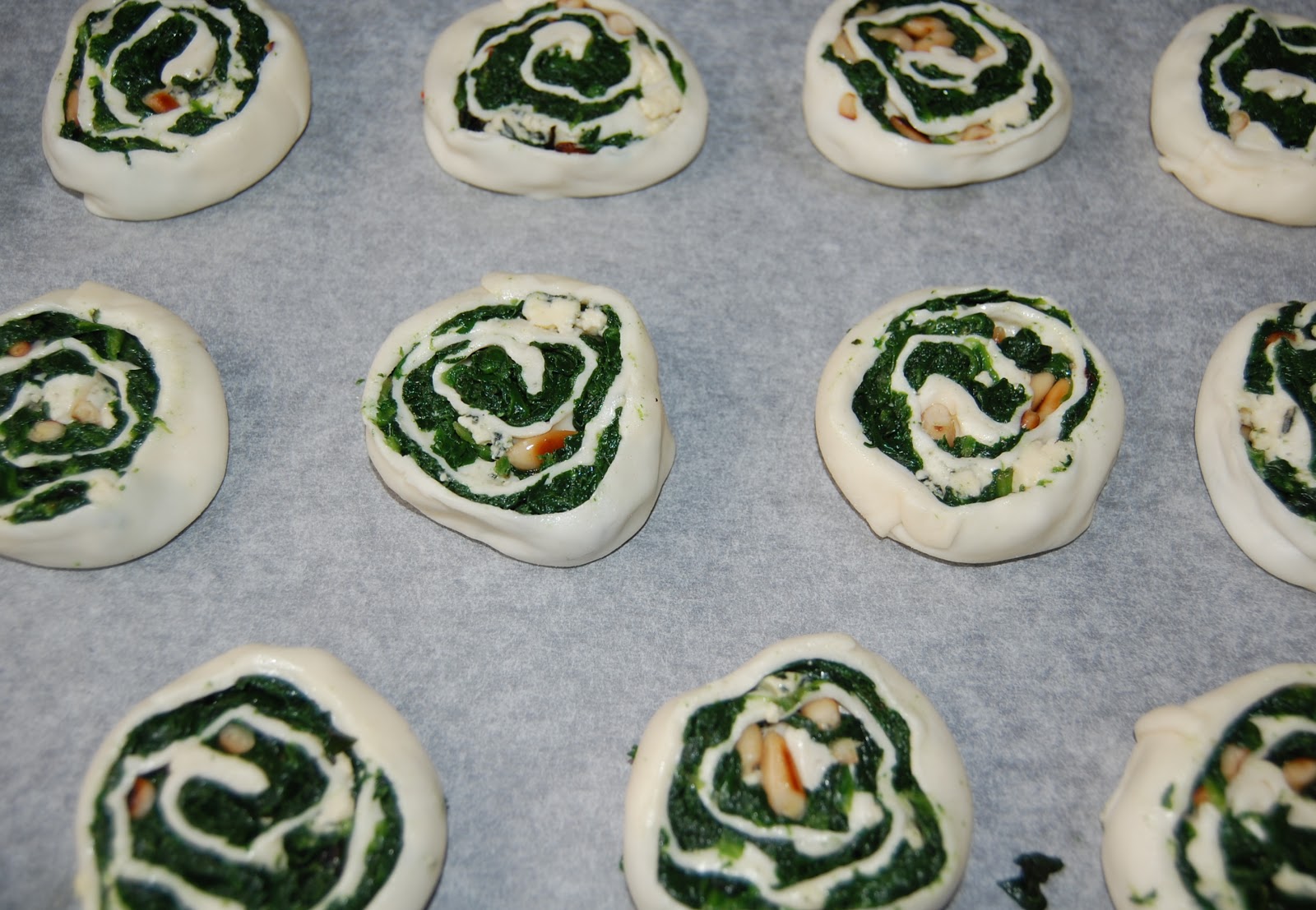 Para hacer los rollitos, ponemos una sartén al fuego con un poco de aceite de oliva. Añadimos las espinacas y rehogamos durante 5 minutos. Añadimos un poco de sal y pimienta. Ponemos las espinacas en un chino y escurrimos hasta que pierdan todo el líquido. Si no hacéis esto, el hojaldre quedará húmedo. En la misma sartén, tostamos los piñones. Cuando estén dorados los apartamos.