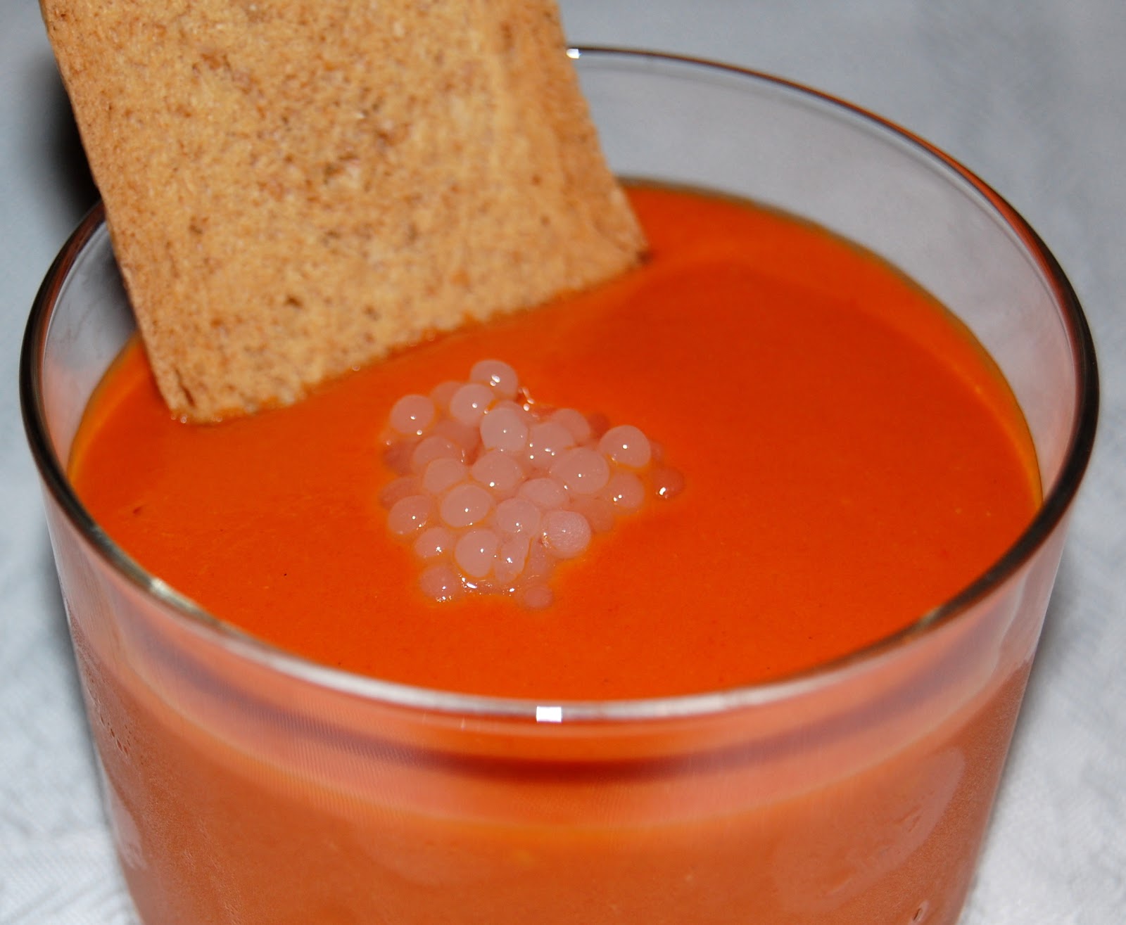 Yo he presentado el salmorejo en un vaso con el caviar de jamón por encima y una tostada a modo de peineta.