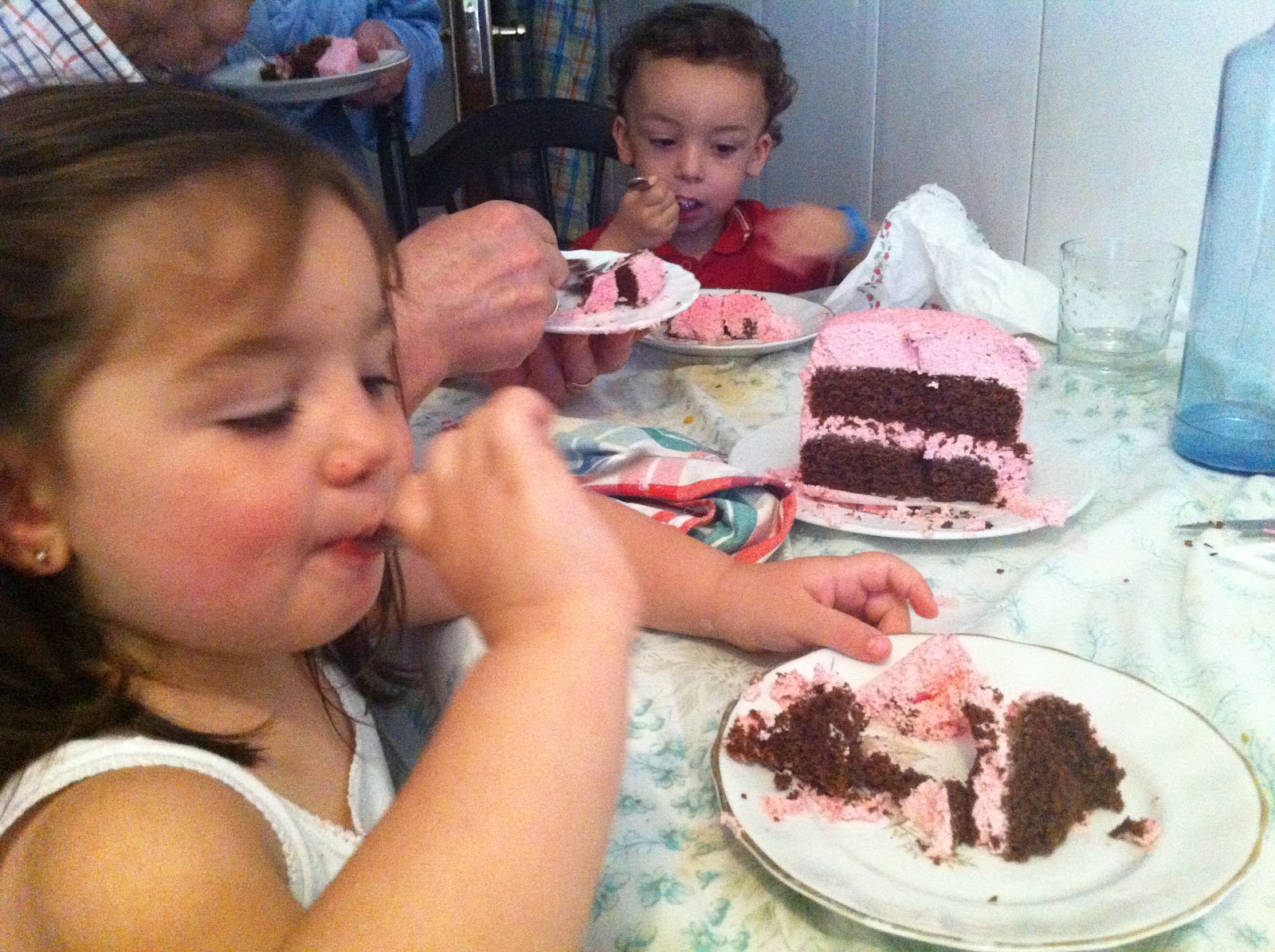 Me he animado a colorear la nata para una de ellas de rosa, porque cuando le pregunté a mi ahijada de qué quería que hiciese la tarta, porque necesitaba que me ayudase a soplar las velas, me dijo: «ROZA!», vale María… pero, ¿de qué? «COCHOLATE!»