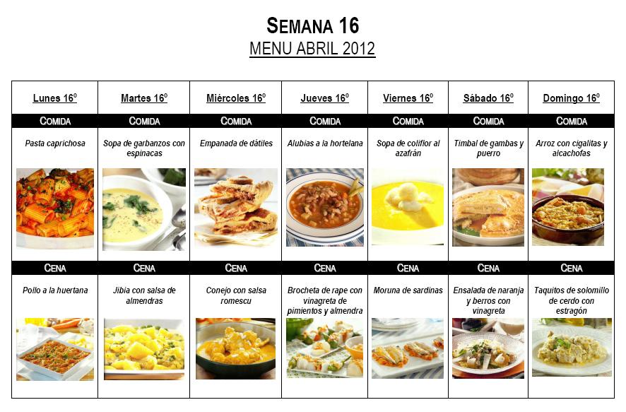 El menú de esta semana tiene más pescado que carne, la verdad es que con la primavera y el calor, me resulta más pesado, comer carne. Como siempre espero que os guste. Saludos a tod@s.