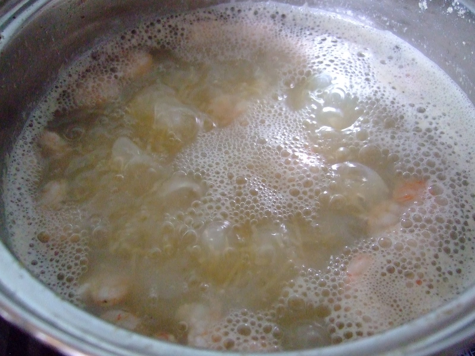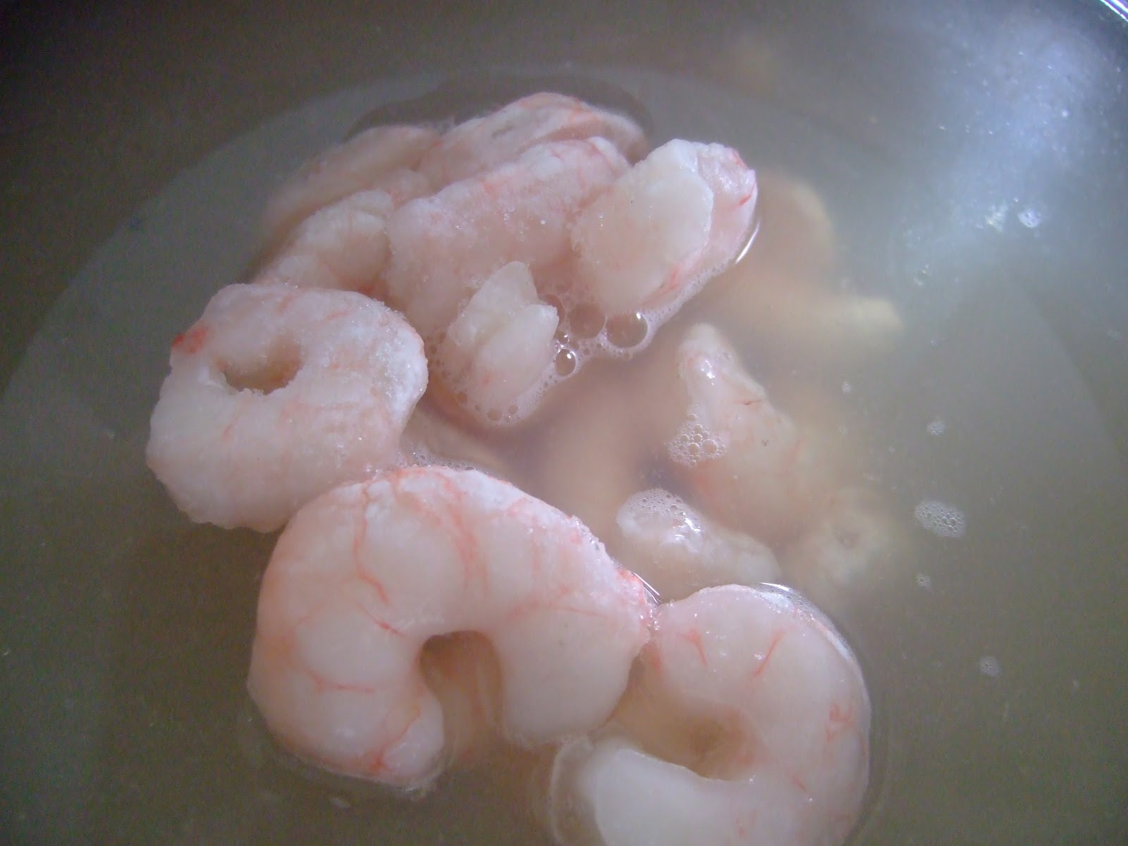 Se le añeden las gambas, en mi caso puse gambas ya congeladas y peladas porque tenia prisa.