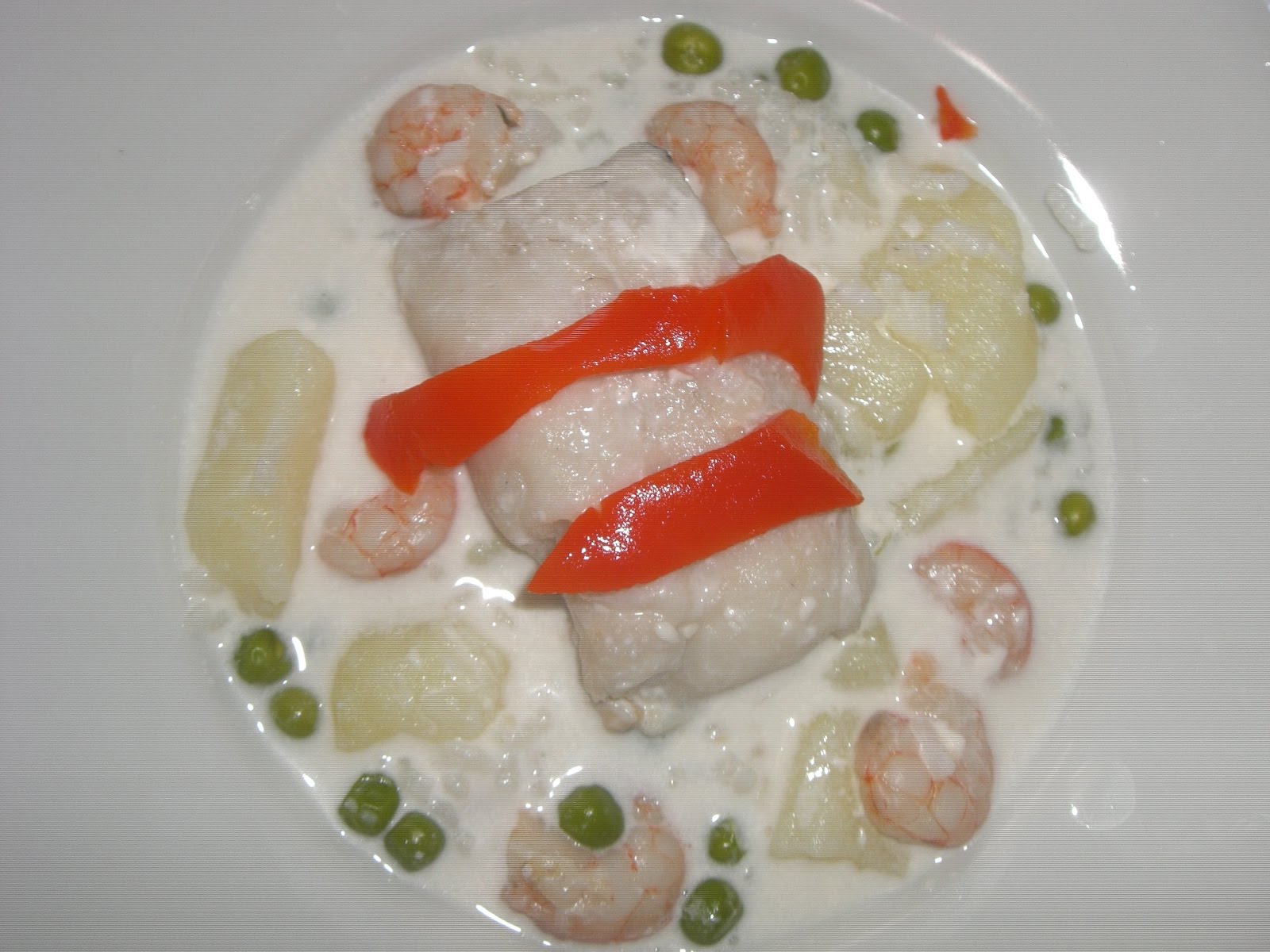 - Colocar las gambas y la merluza en una sopera, añadir el contenido del cestillo y esperar 5 minutos a que baje la temperatura.