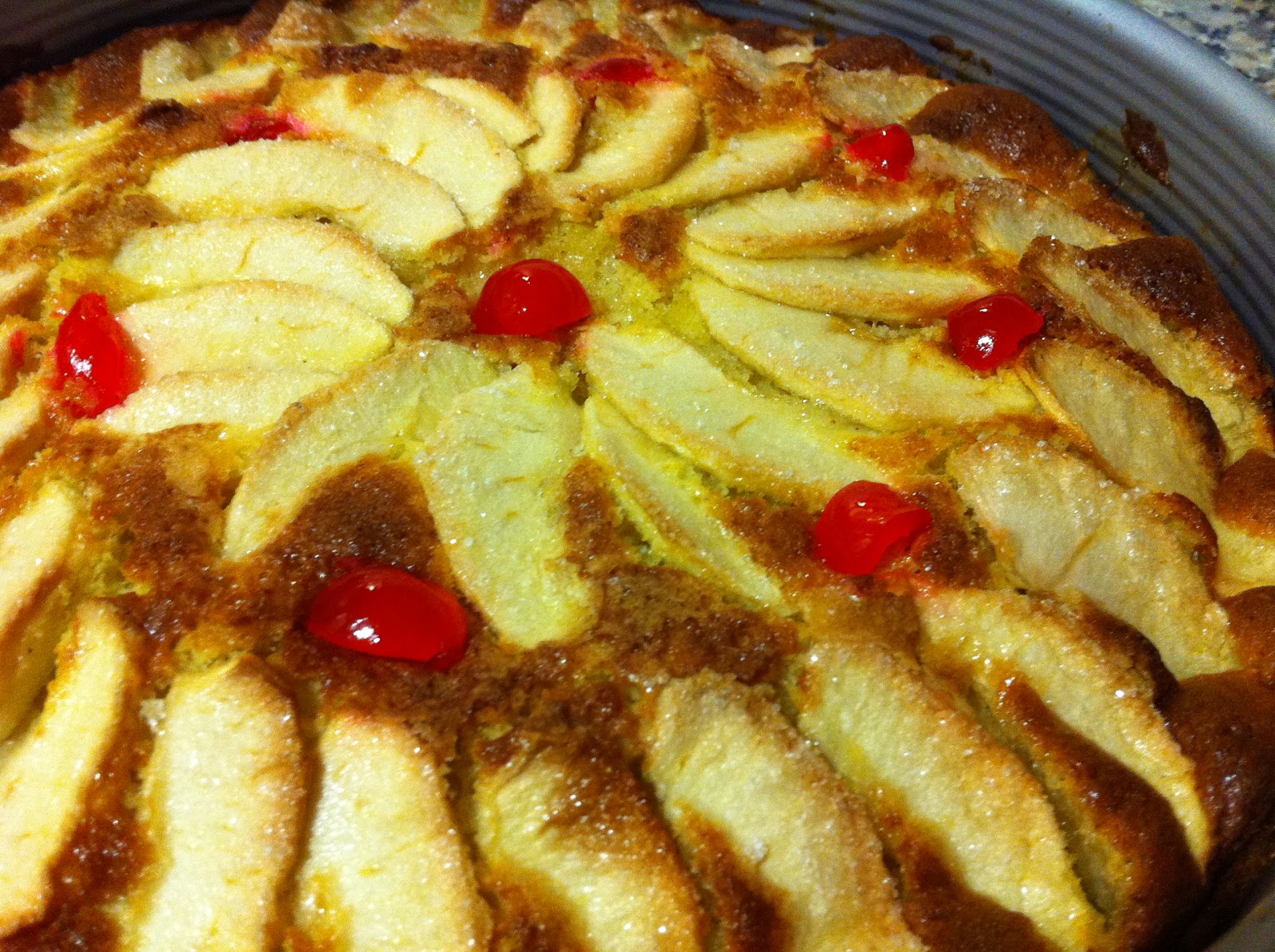 Pelamos y cortamos el resto de las manzanas en forma de gajos finos y los colocamos en círculos, cubriendo toda la superficie del molde. Si queremos, podemos adornar también con unas guindas.