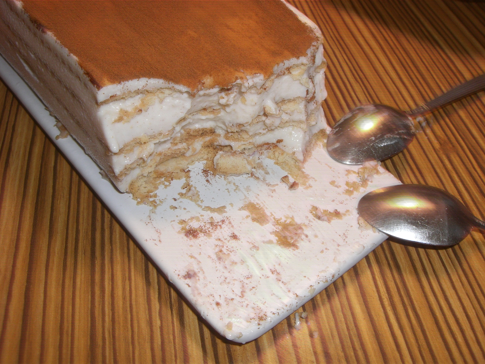 – En un molde cuadrado ó de plum-cake , colocar una base de galletas y verter cuatro cucharadas grandes de la crema. Continuar alternando galletas y crema , terminando con la crema. Espolvorear de canela molida y dejar reposar en el frigorífico durante 3 ó 4 horas.