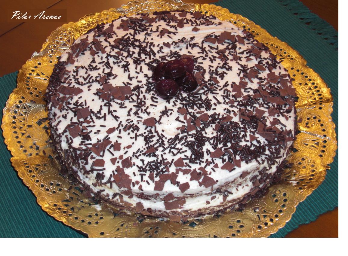 - Pinta con el licor de las cerezas la cara interna de la otra mitad del bizcocho, ponlo encima dándole su forma original. Cubre todo el bizcocho con la nata montada restante, alisándola con la espátula.