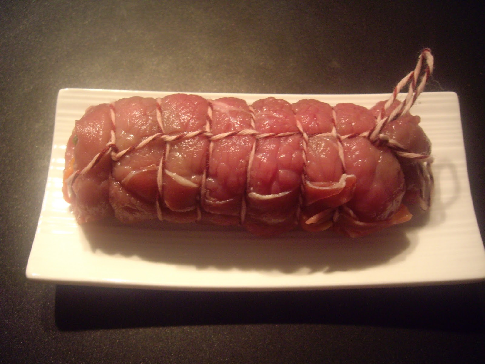 Ahora vamos enrollando, preocupándonos de que el rollo quede bien prieto. Cuando tengamos el rollito hecho, atamos con un hilo de cocina. Si lo hacemos con filetes, podemos utilizar palillos para que no se abra y mantenga la forma cilíndrica.