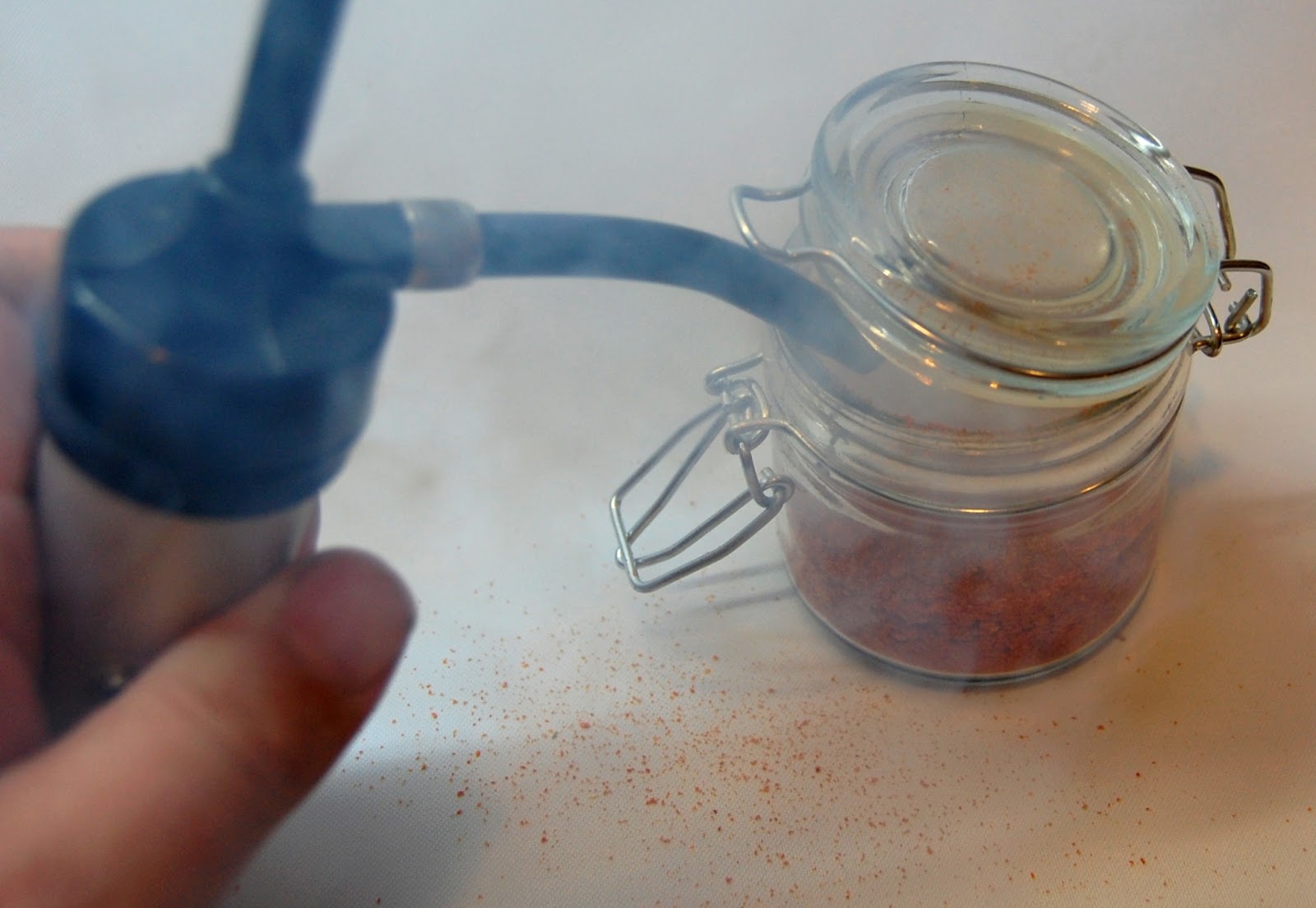 Poned el serrín en la cazoleta y prended mientras accionáis la pipa. Abrid un poco el tarro del polvo de tomate y «a soplar». Cerrad inmediatamente.