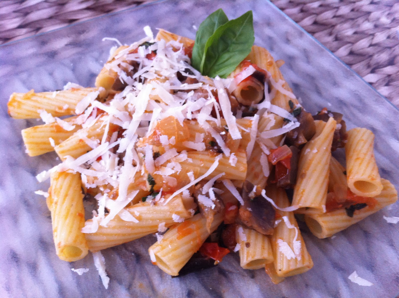 Escurrimos la pasta y la vertemos junto con la berenjena en la sartén con la salsa de tomate reservada.
