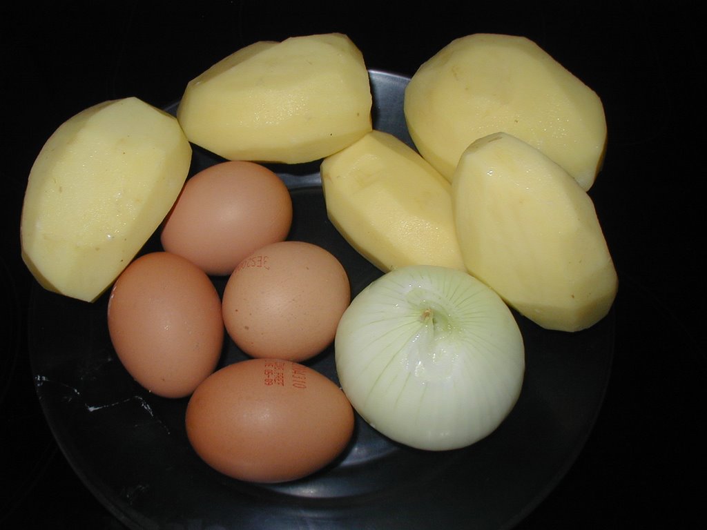 Ponemos abundante aceite de oliva en una sartén dejamos calentar, una vez caliente añadimos las patatas y cebollas cortadas en laminas finas de patata y cebolla.