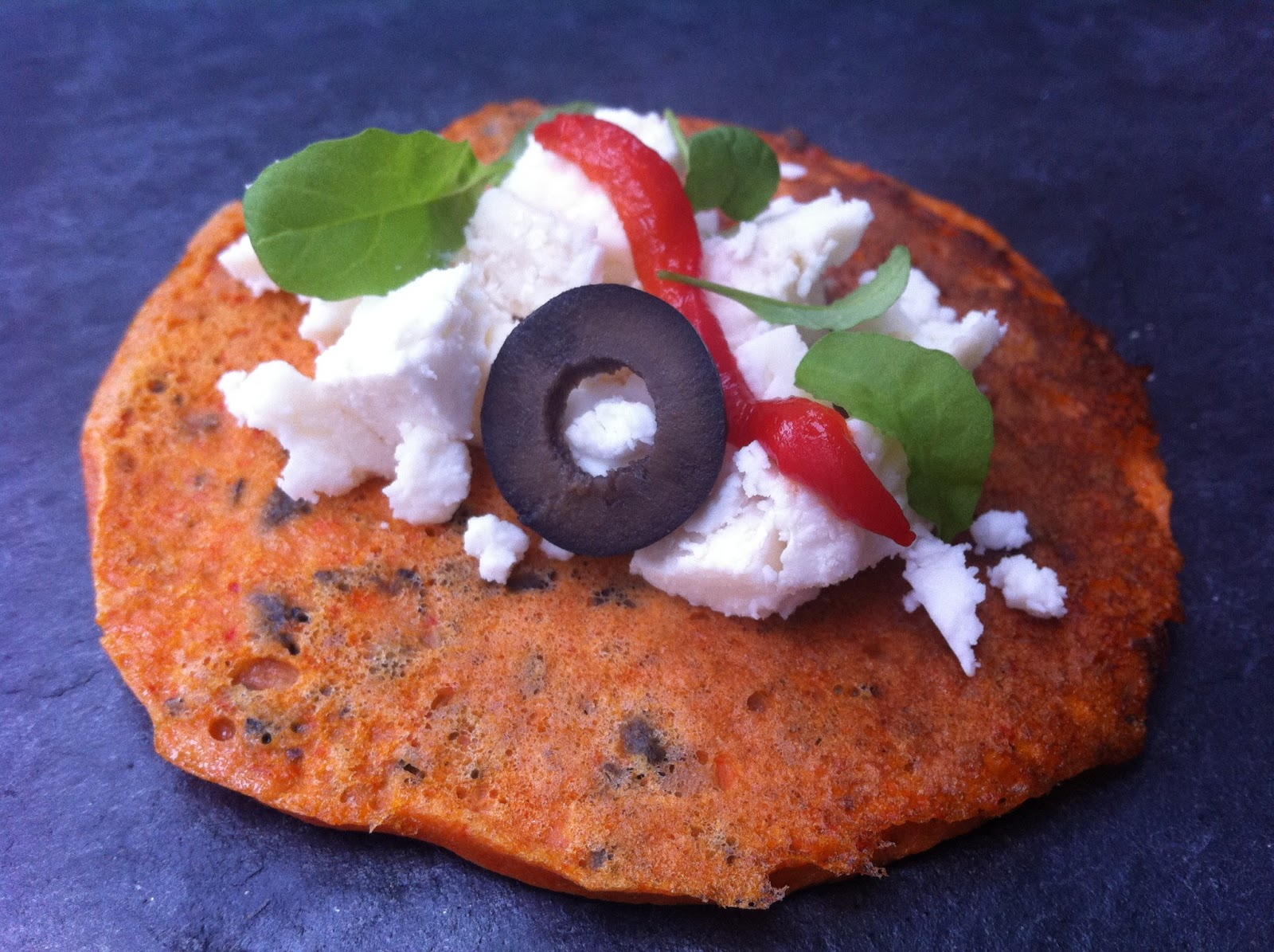 Servimos las tortitas con un queso fresco y suave, desmenuzado. Vertemos un hilillo de aceite sobre él, y espolvoreamos con hierbas frescas de nuestra elección.