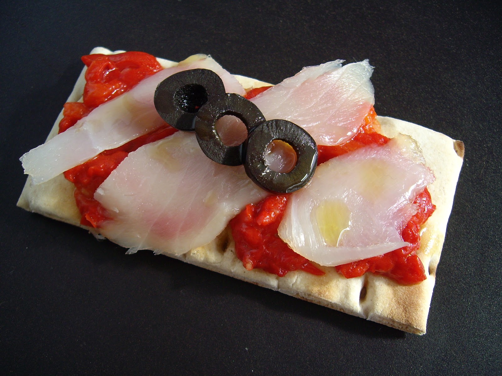 Disponemos los pimientos sobre el pan tostado, cubrimos con unas lonchas de bacalao ahumado y decoramos con unas aceitunas negras. Riquísimo!