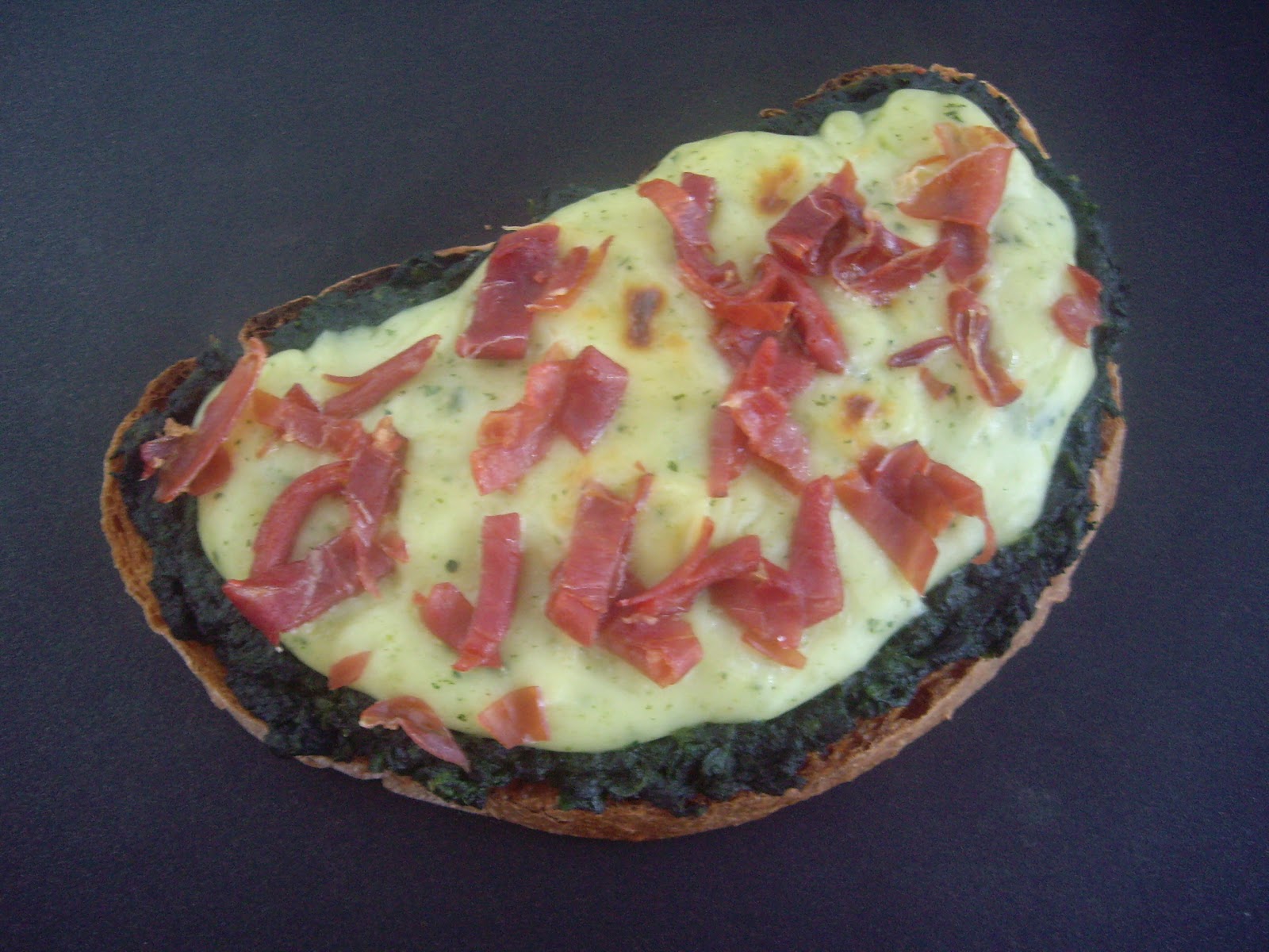 Repartimos las espinacas por encima de las tostadas de pan, vertemos sobre ellas la bechamel y ponemos encima el jamón, a nuestro gusto (en taquitos, tiritas, lonchas…) y al horno a gratinar.
