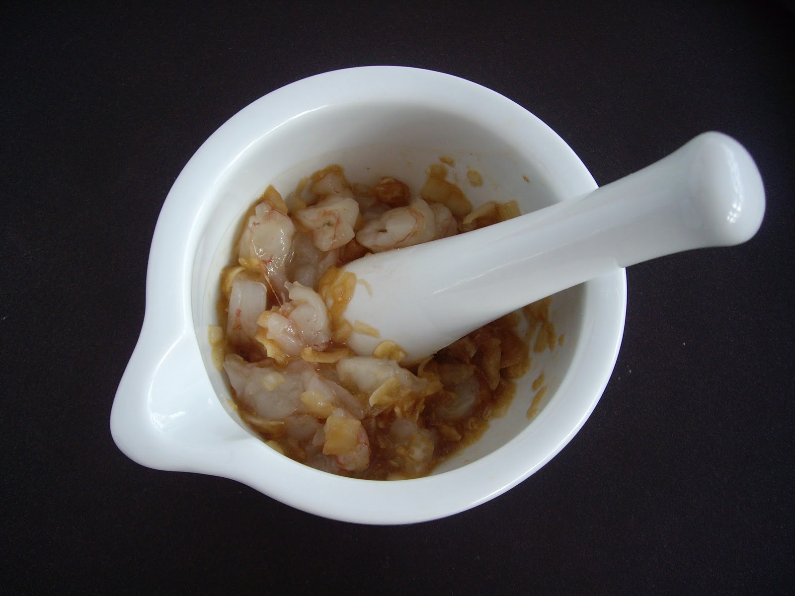 Picamos la cebolleta, el ajo, el jengibre y las gambas finamente. Podemos machacar todo en un mortero o pasarlo por la batidora, dependiendo de la cantidad de ingredientes y de nuestro gusto.