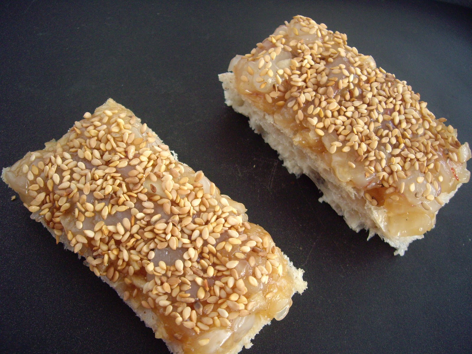 Cortamos cada tostada de pan en dos rectángulos y untamos la pasta de las gambas por uno de los lados. Espolvoreamos con semillas de sésamo y guardamos en el frigorífico durante una media hora.