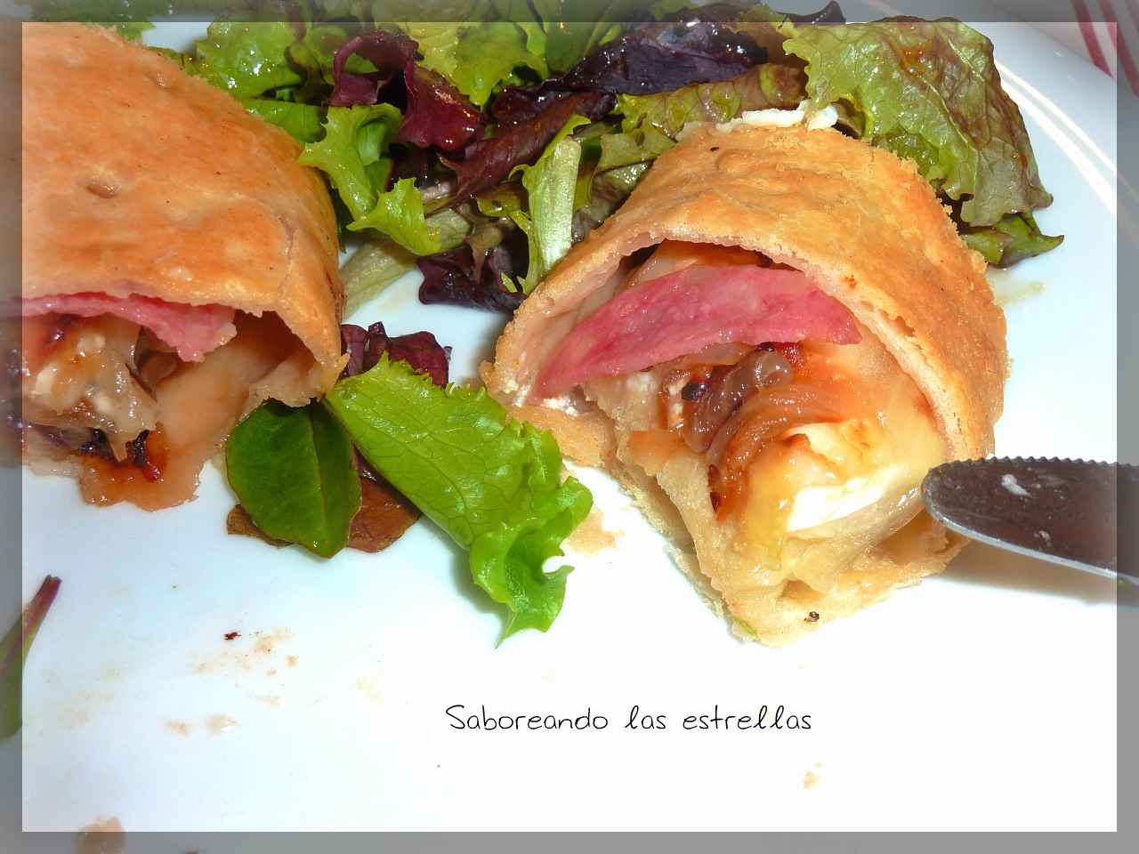 Esta receta, del blog saboreando las estrellas, me ha encantado para tenerla preparada con antelación, pero modificando un ingrediente: rellena de jamón york, o pechuga de pavo, no de salchichón.