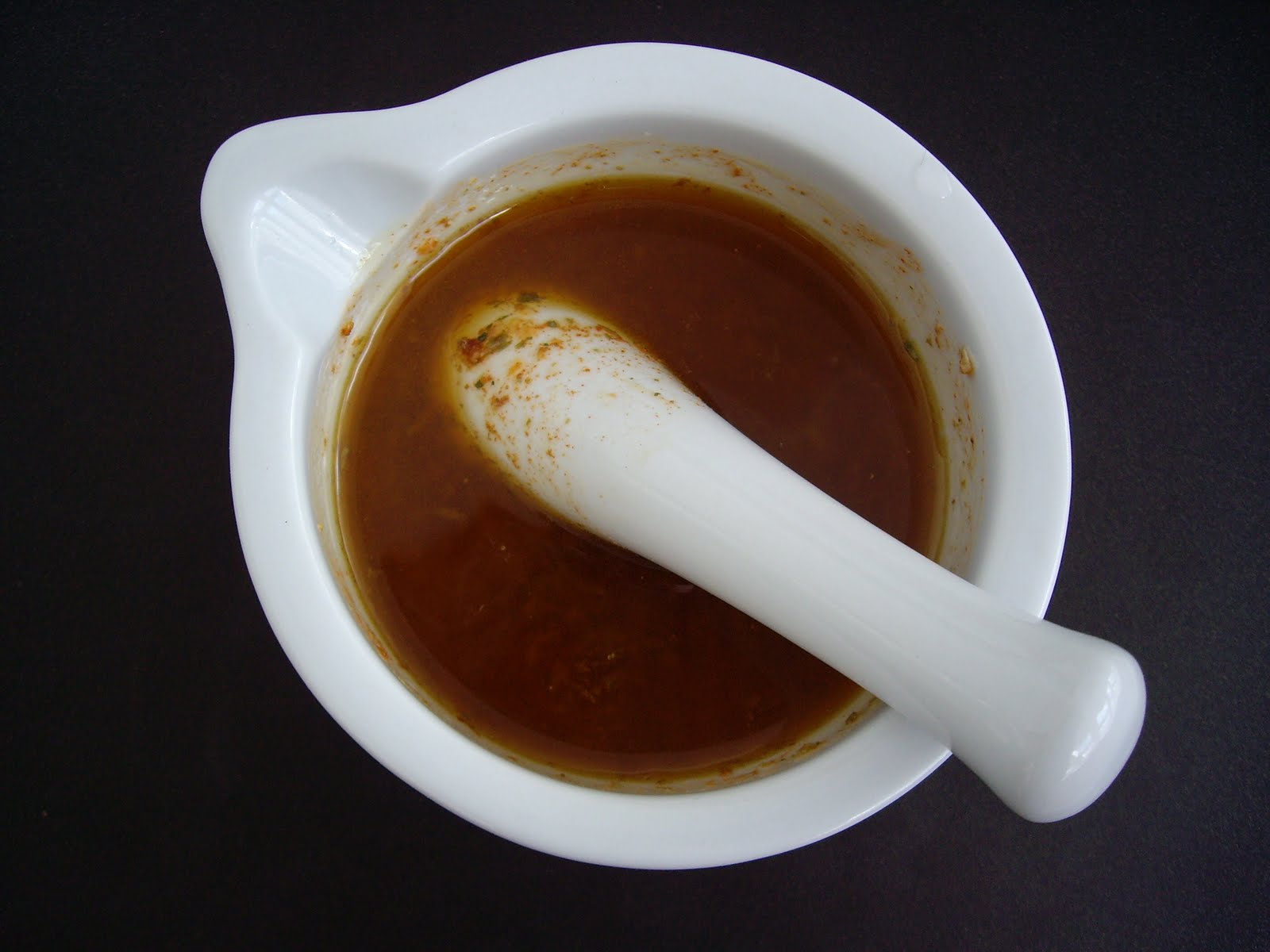 Por último añadimos al mortero un poco de agua con el que cocimos las zanahorias (100 ml.), y aproximadamente lo mismo de vinagre y aceite.